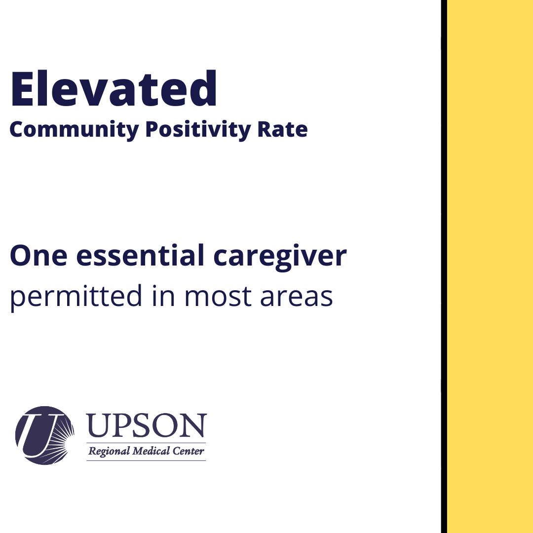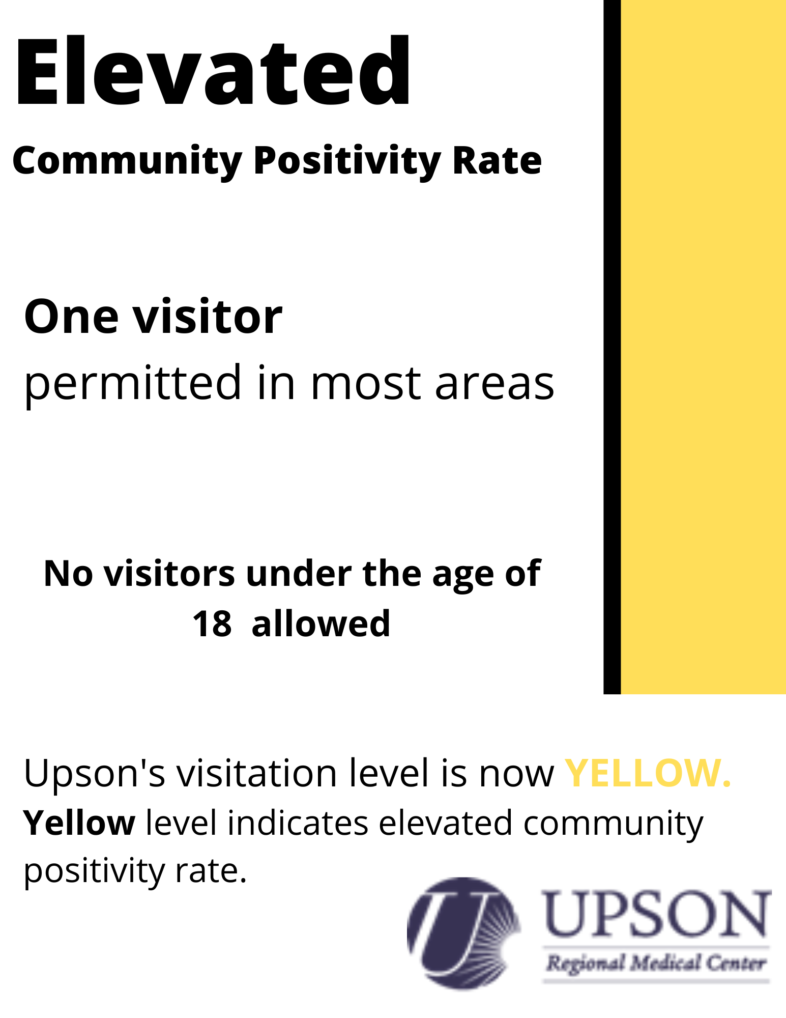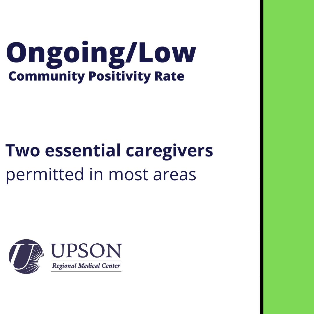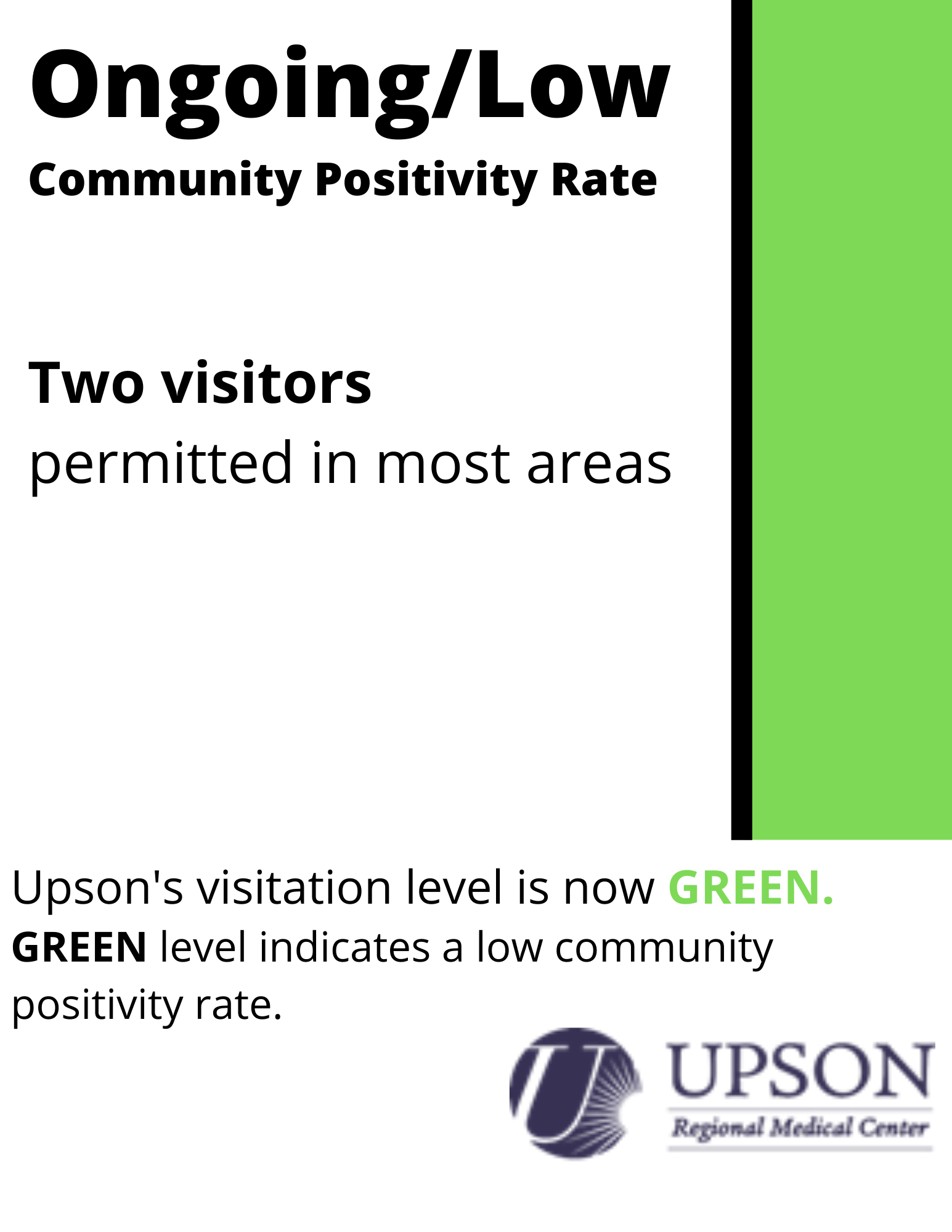 URMC remains committed to proactively protecting Georgians from COVID-19 with expanded safe visitation protocols. URMC's visitation level is now level Green. Two visitors are allowed for each patient in most areas of the hospital between the hours of 8am-8pm. Except under special circumstances, visitation for COVID patients still cannot be allowed.