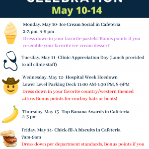 Happy Hospital Week to all of the special team members who make URMC a great hospital! This week is dedicated to you and we hope to show our gratitude with all of the great things planned this week. Monday is our Ice Cream Day with an Ice Cream Social at 2pm – 3pm in the cafeteria and 8pm – 9pm. Tuesday is Clinic Appreciation Day with lunch provided for all clinics. Wednesday is the Hospital Week Hoedown with lots of great activities and food planned for day shift (11am – 1:30pm) and...