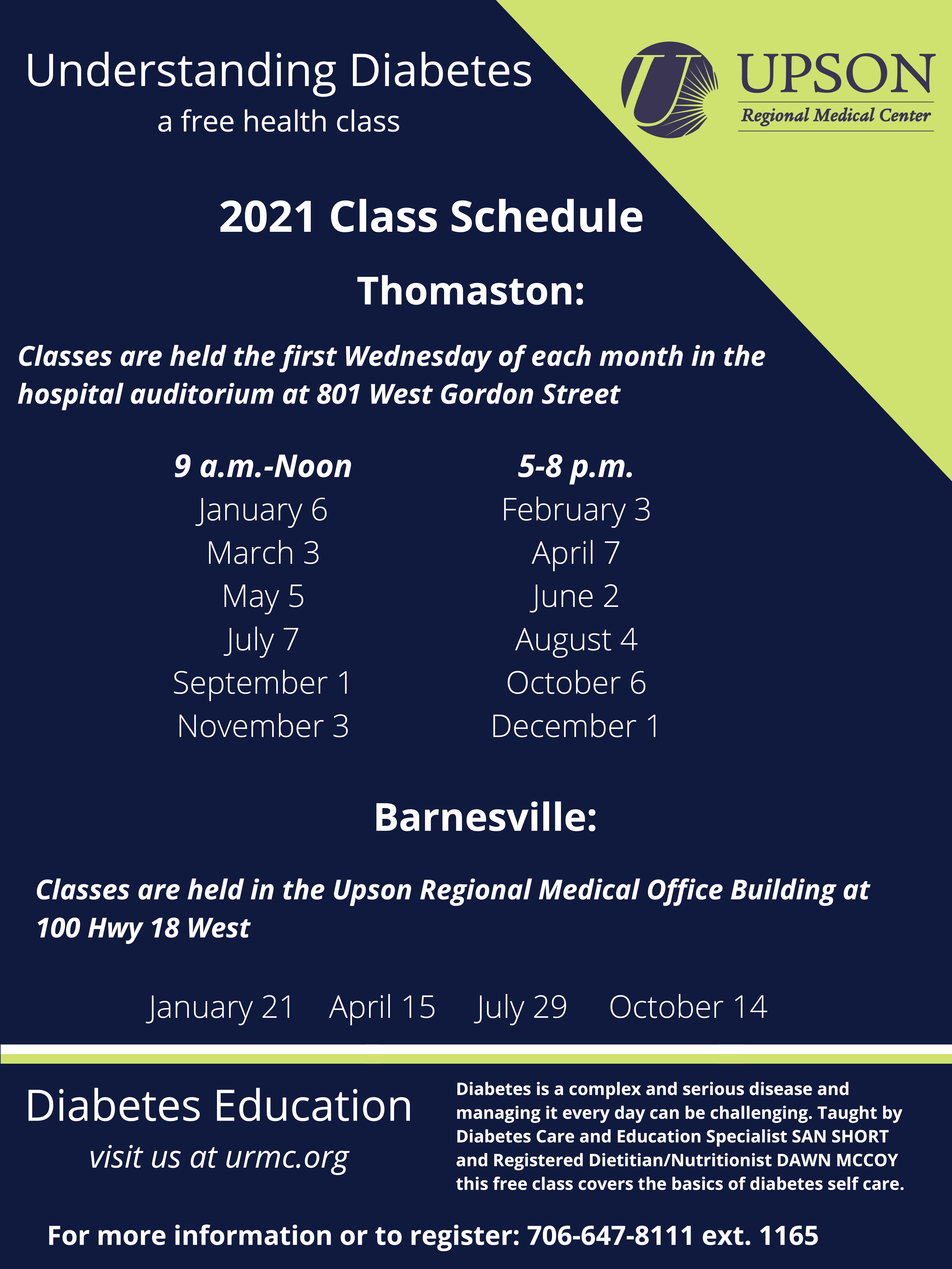 Diabetes is a complex and serious disease and managing it every day can be challenging. Taught by certified Diabetes Educator and Specialist San Short and registered Dietitian/Nutritionist Dawn McCoy, this free class covers the basis of diabetes self care. For information about class dates and how to register, call 706-647-8111 ext. 1165.